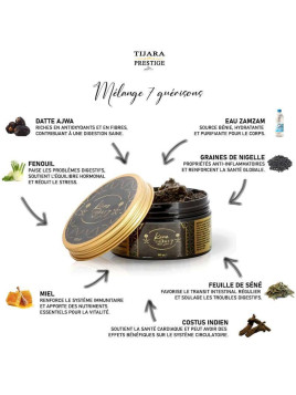 Miel enrichi à la graine de nigelle, gelée royale et pollen d'abeille. Composition: Miel de montagne 70% Graine de Nigelle 20% Gelée Royal 5% Pollen de d'Abeille 5% Pot de 300 gr