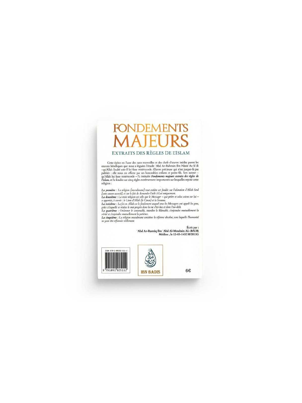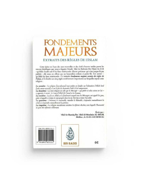 Cette épître est l'une des rares merveilles et des chefs d’œuvres inédits parmi les œuvres bénéfiques que nous a léguées l'érudit 'Abd Ar Rahman Ibn Nassir As Sa'di qu'Allah exalté soit-Il lui fasse miséricorde. Oeuvre précieuse qui n'est jusque-là pas publiée; elle nous est offerte par ses honorables enfants et petits-fils. Son auteur qu'Allah lui fasse miséricorde l'a intitulée "Fondements majeurs extraits des règles de l'Islam", et l'a fondée sur cinq règles extrêmement importantes sur lesquelles repose cette religion :