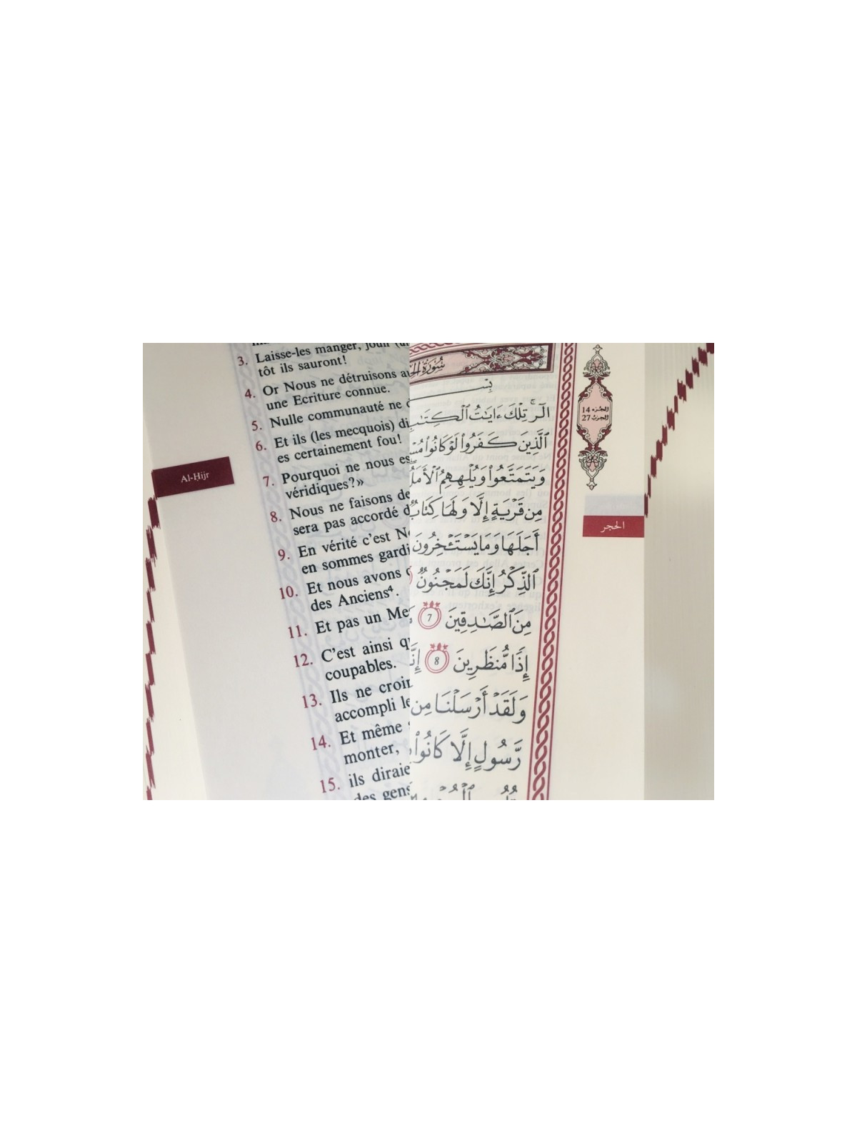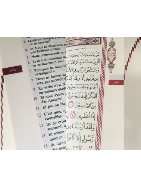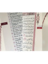 Avec index des sourates visible sur la tranche du livre permettant un accès plus rapide au début de chaque sourate. Pour les sourates longues, permet de connaître visuellement le nombre de pages qu'il nous reste à lire pour finir la sourate.