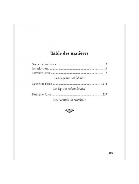 Les éditeurs et les exégètes des Hikam ont coutume de leur adjoindre deux autres écrits d’Ibn ‘Atâ : les Épîtres et les Apartés. Les Épîtres sont des lettres qu’il adresse à des frères en religion et dans lesquelles il promulgue cer- taines vérités et recommandations. Quant aux Apartés, ce sont des monologues dans lesquels il livre à son Seigneur ses états d’âme, et où Lui fait part de ses inquiétudes et de ses espérances.