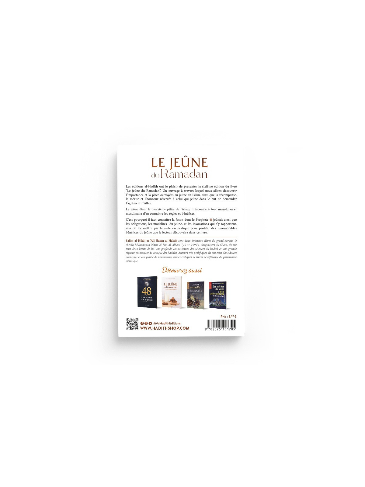Les éditions al-Hadith ont le plaisir de présenter la quatrième édition du livre "Le Jeûne du Ramadan". Un ouvrage à travers lequel nous allons découvrir l'importance et la place octroyée au jeûne dans l'Islam, ainsi que la récompense, le mérite et l'honneur réservé à celui qui jeûne dans le but d'acquérir l'agrément d'ALLAH.