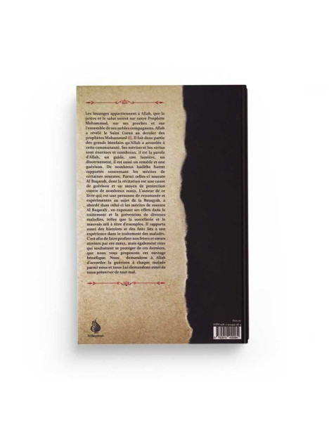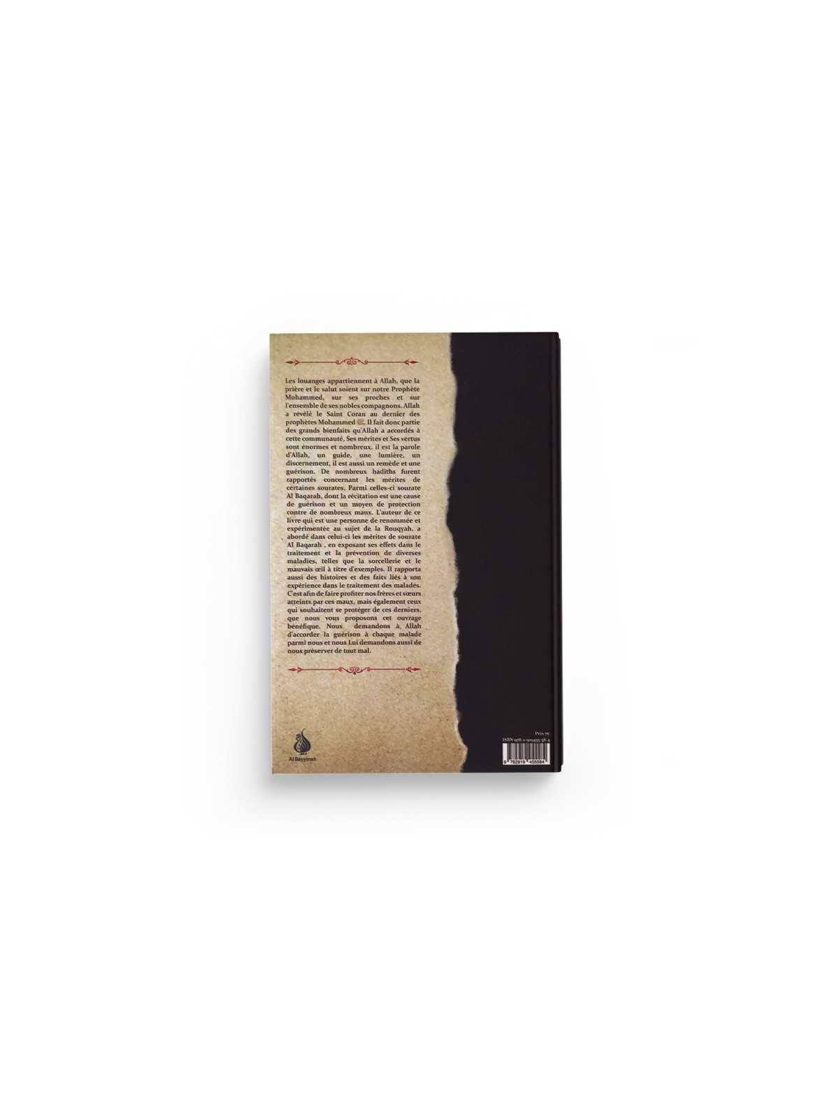 L'auteur de ce livre qui est une personne de renommée et expérimentée au sujet de la Rouqyah, a abordé dans celui-ci les mérites de sourate Al Baqarah, en exposant ses effets dans le traitement et la prévention de diverses maladies, telles que la sorcellerie, le mauvaise œil à titre d'exemples. Il rapporta aussi des histoires et des faits liés à son expérience dans le traitement des maladies. C'est afin de faire profiter nos frères et sœurs atteints par ces maux, mais également ceux qui souhaitent se protéger de ces derniers, que nous vous proposons cet ouvrage bénéfique. Nous demandons à Allah d'accorder la guérison à chaque malade parmi nous et nous Lui demandons aussi de nous préserver de tout mal.