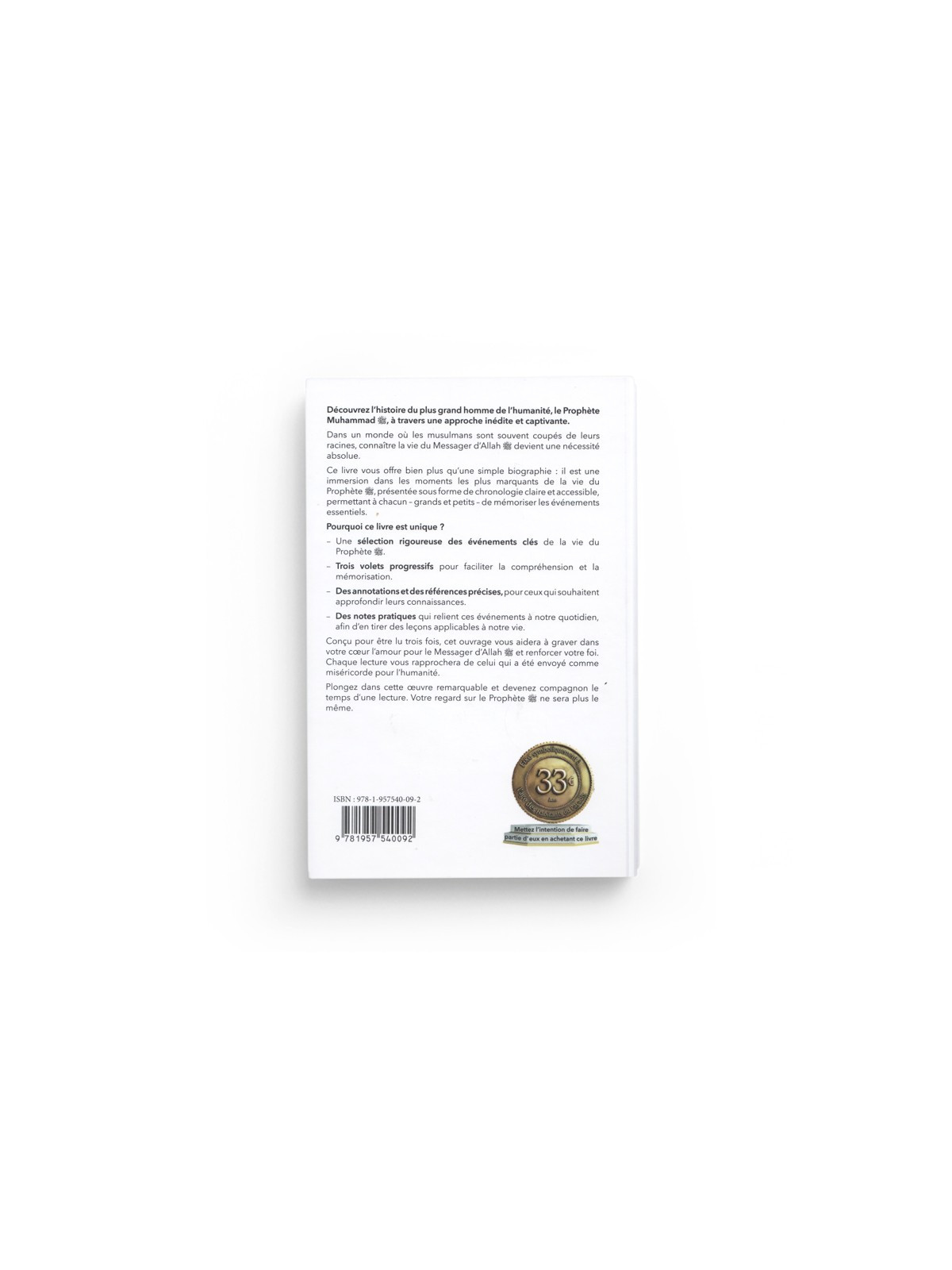 Conçu pour être lu trois fois, cet ouvrage vous aidera à graver dans votre cœur l'amour pour le Messager d'Allah et à renforcer votre foi. Chaque lecture vous rapprochera de celui qui a été envoyé comme miséricorde pour l'humanité.