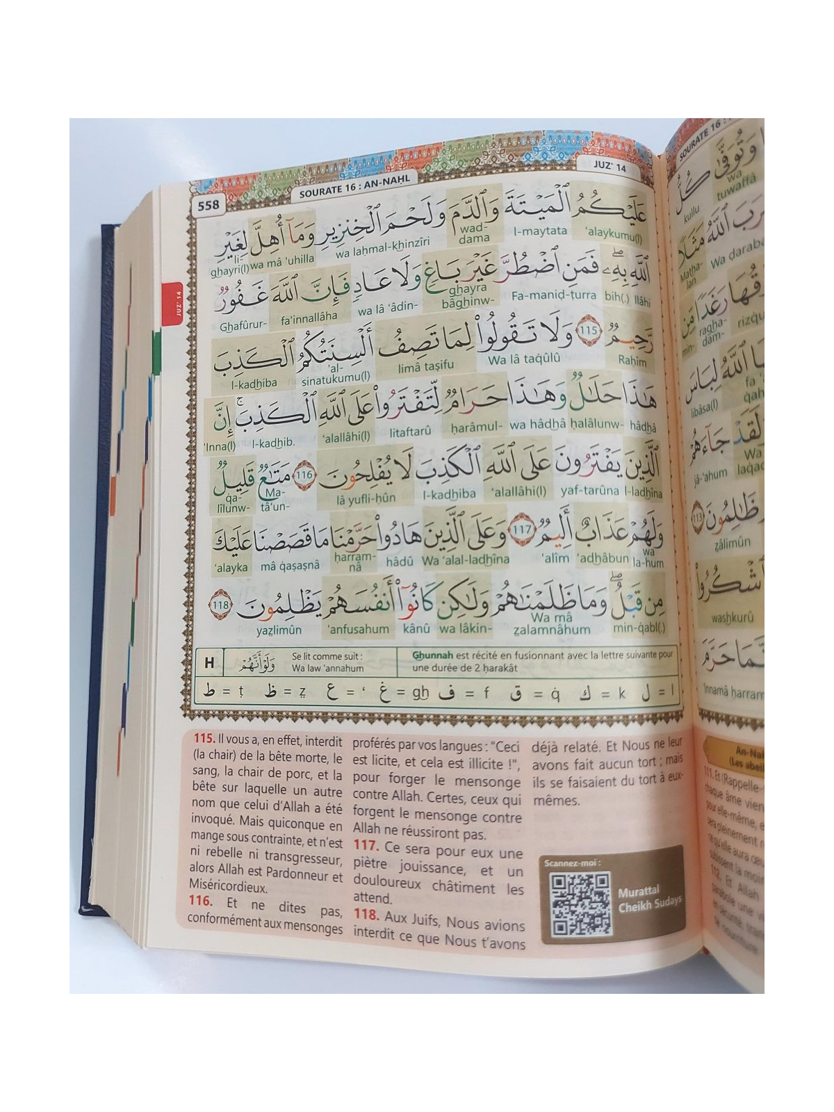 Les règles de tajwid sont données par un système de couleur intuitif pour apprendre les règles de lecture et de psalmodie du Saint Coran et le code QR (présent sur chaque page) permet d'ouvrir une vidéo sur son smartphone et d'écouter et suivre la lecture du Coran par cheikh Soudays.
