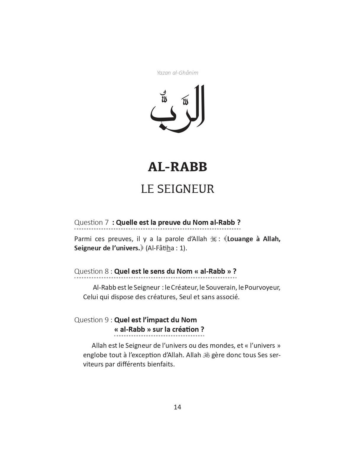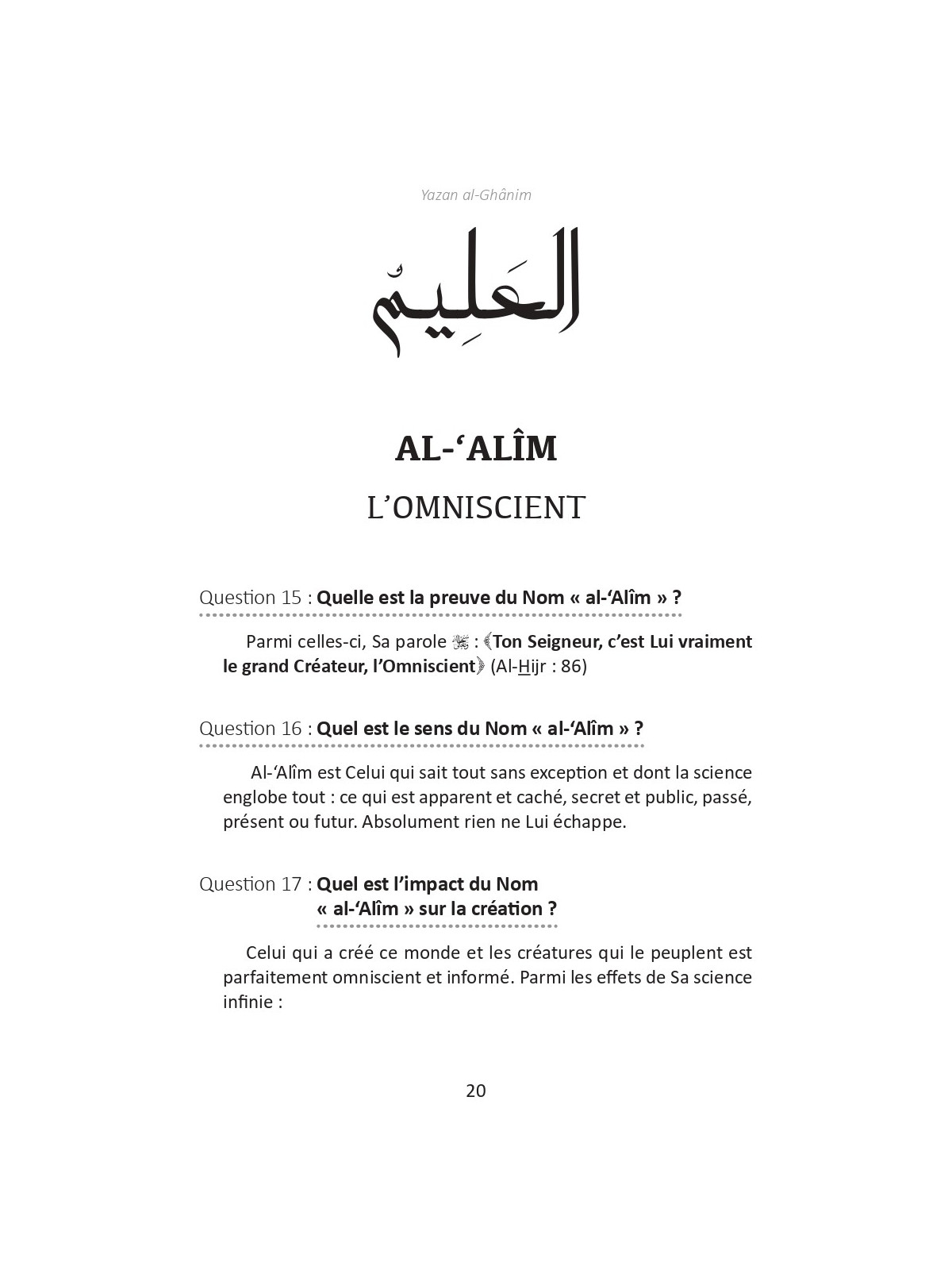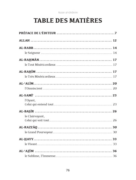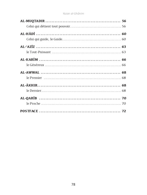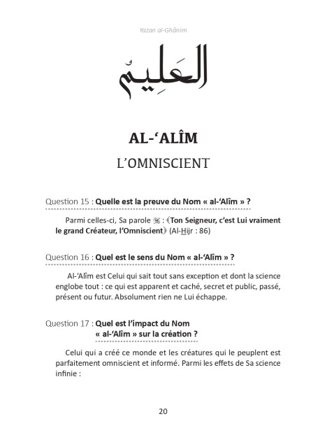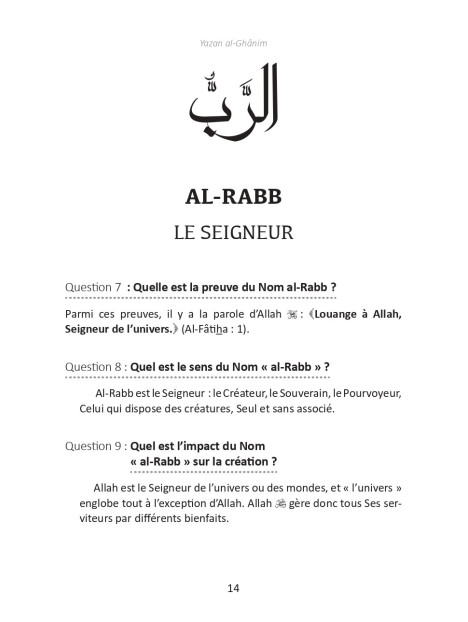 Dans ce livre, concis mais concentré, parents et enseignants trouveront une explication d’une sélection des plus beaux Noms d’Allah, avec mention des preuves de ces Noms dans le Coran et/ou dans la Sunna. Chaque Nom est suivi d’une réflexion sur son impact dans la création et de pistes pour adorer Allah U à travers ce Nom. Ce qui en fait un livre d’une valeur hautement pédagogique susceptible, par la permission d’Allah, de stimuler la spiritualité de nos jeunes au quotidien.