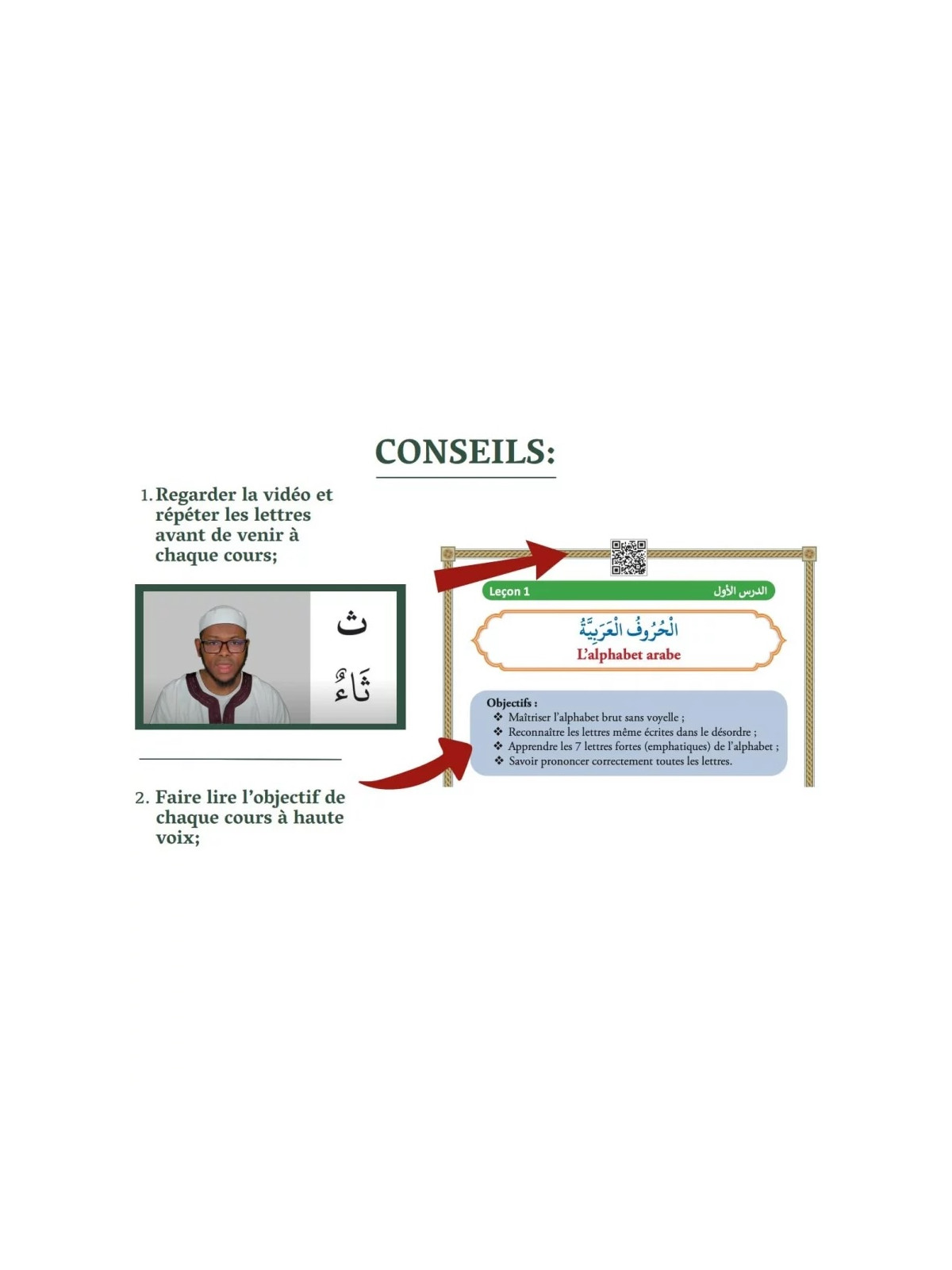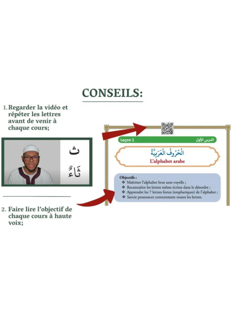 Un véritable atout de ce livre : il contient des QR codes permettant d'accéder à des vidéos explicatives pour chaque leçon, afin de suivre visuellement et d'assimiler le contenu de manière interactive. Inspiré des méthodes traditionnelles Nouraniyya, Bagdadiyya et Nour al-Bayan, ce livre est idéal pour les enfants comme pour les adultes. 20% du prix du livre seront reversés pour la construction d'un centre de mémorisation en Guinée, vous avez donc la possibilité de faire une sadaqa jariya.