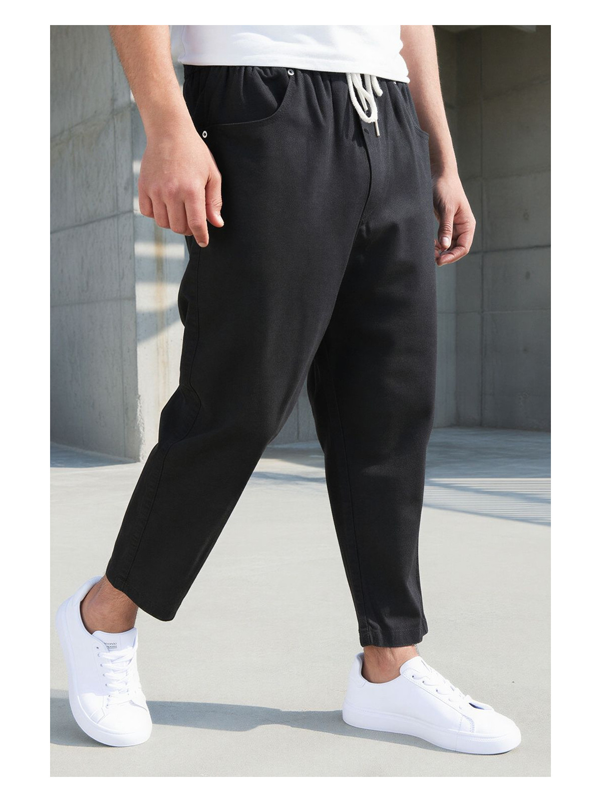 Modèle avec coupe droite et tombé net, ouvert au niveau de la cheville pour un rendu moderne et épuré.