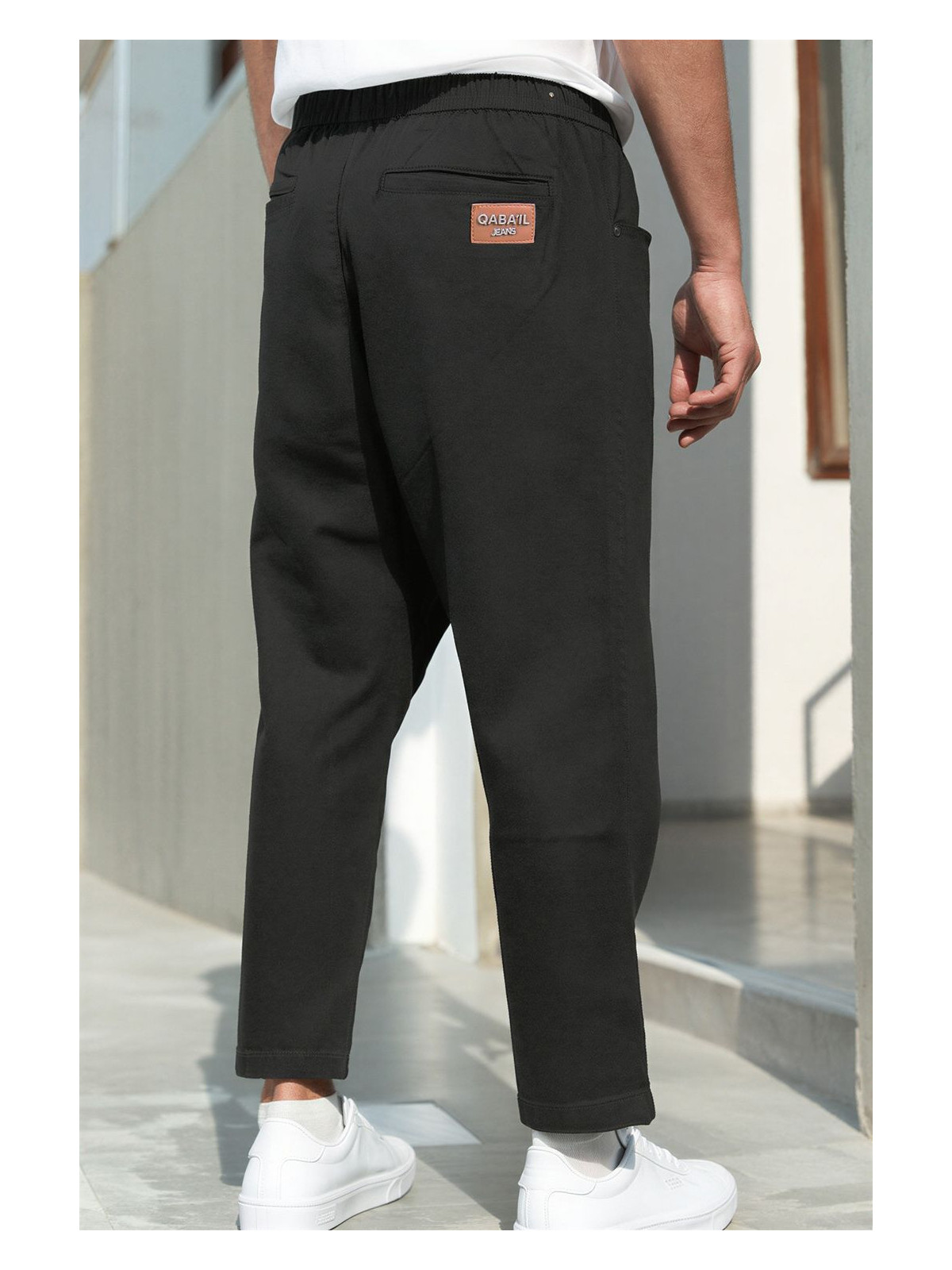 Taille élastique avec cordon de serrage, finitions propres avec poches discrètes et patch Qaba’il à l’arrière.