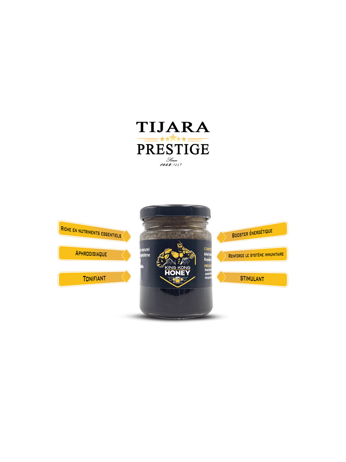 Fabriqué à partir de ginseng, de gelée royale bio, de clou de girofle, de gingembre et de propolis, le miel King Kong se présente comme un booster naturel. Vous ne le savez peut-être pas, mais il s'agit également d'un puissant aphrodisiaque. On l'apprécie également car il doit sa puissance à des éléments purement naturels !